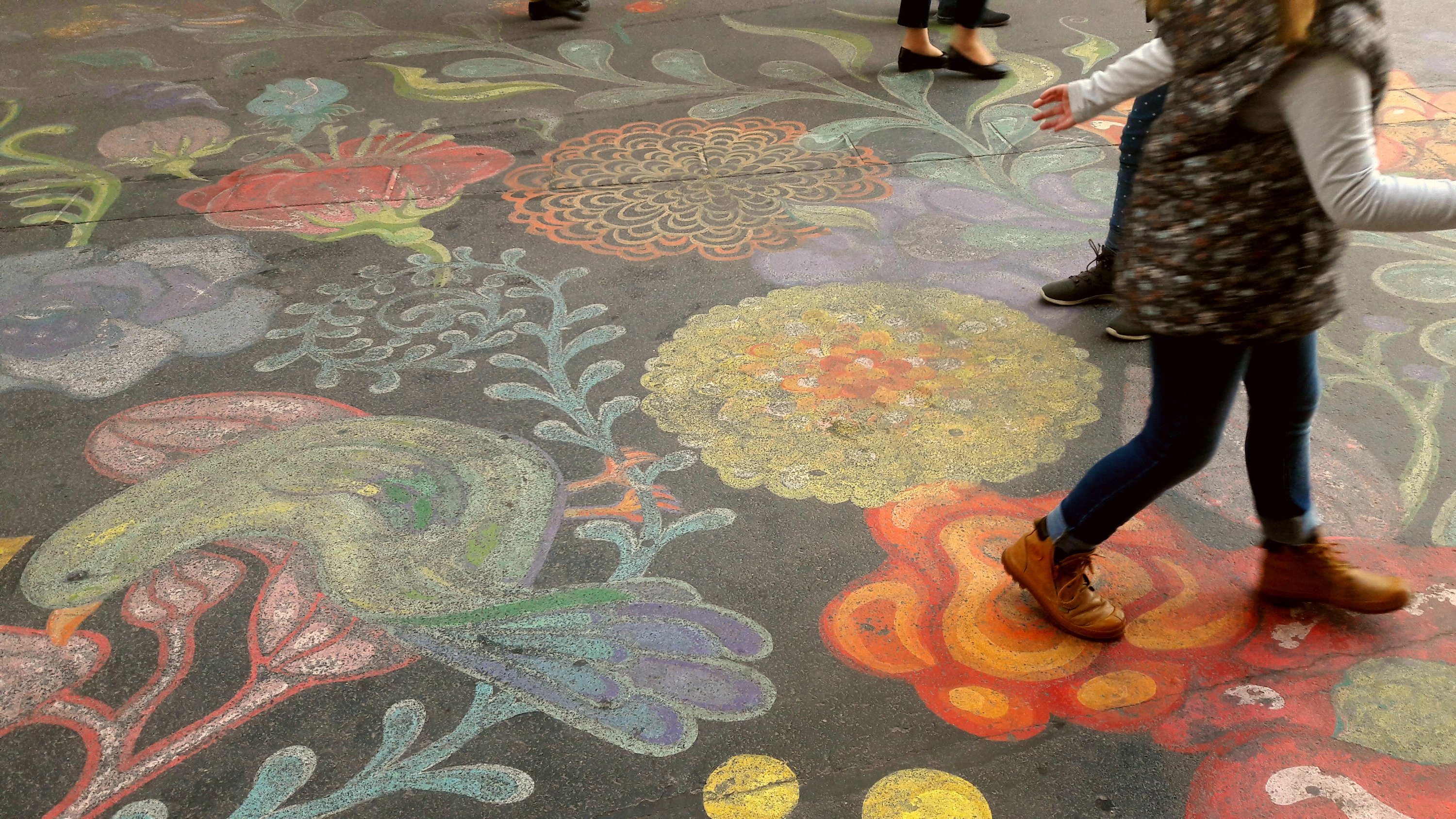 I dok one jurcaju trgom, nailazimo na ogrome cvetove, bulke iscrtane kredom, poput veza na narodnim nošnjama. Preskaču ih, pažljivo, i odlazimo dalje ka Botaničkoj bašti, tamo kroz neke visoke krošnje, živice i leje sa cvećem, tražimo ružičnjake.